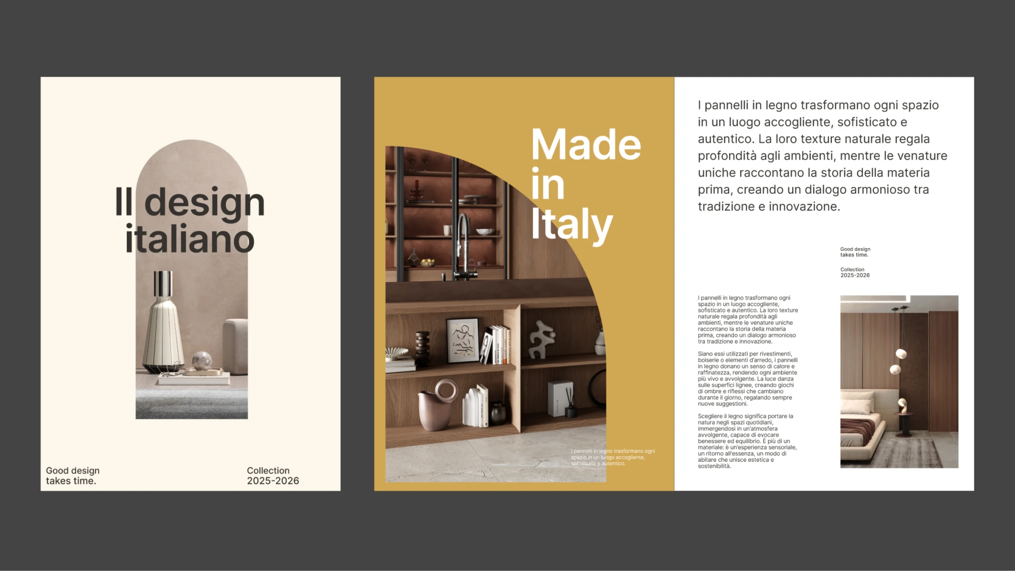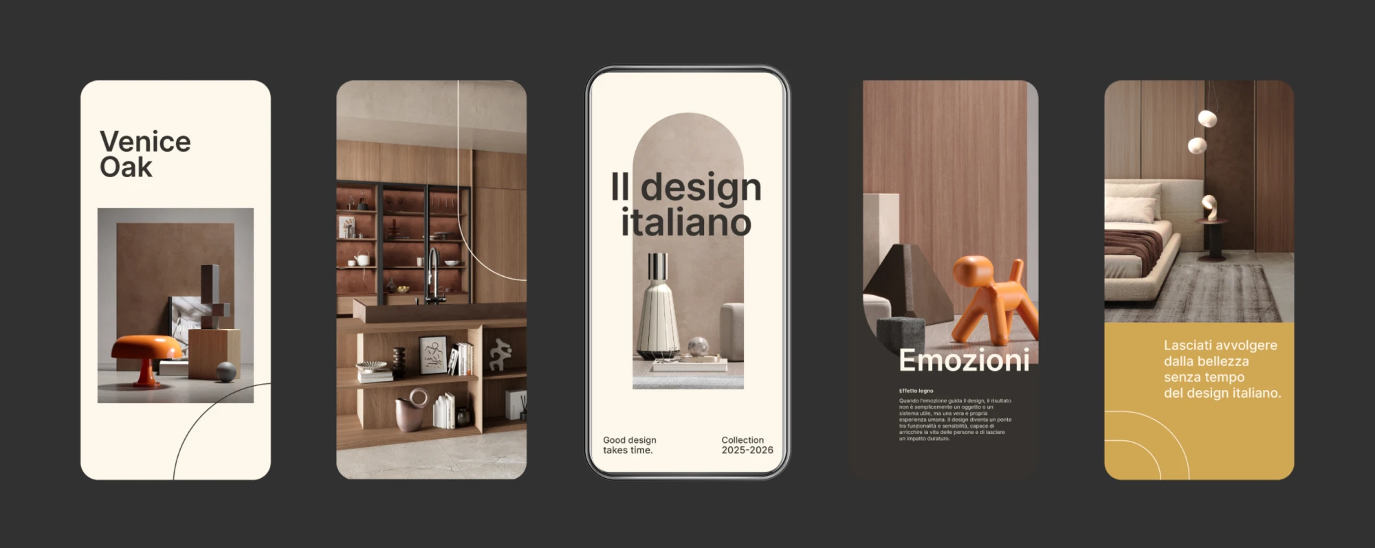 Forme, font, colori e texture richiamano il patrimonio artistico e culturale italiano: elementi iconici del design, stili architettonici che hanno segnato epoche e dettagli decorativi che raccontano la qualità artigianale.