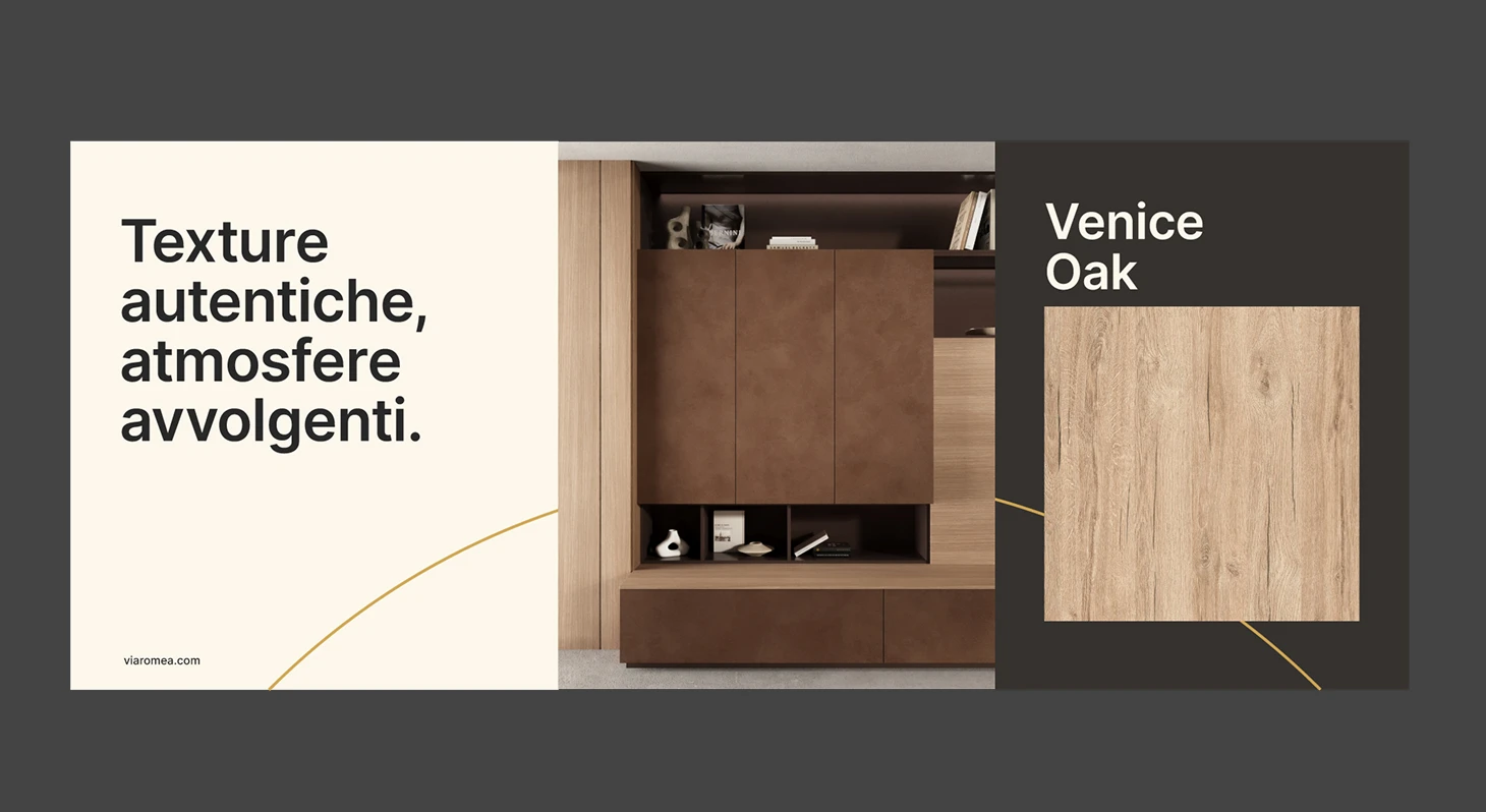 Da qui, la declinazione lungo tutti i touchpoint: sito web, materiali di comunicazione, stand fieristici, campionario. Un ecosistema coordinato che trasforma Viaromea in un’esperienza completa, coerente e memorabile per designer, architetti e professionisti del progetto.